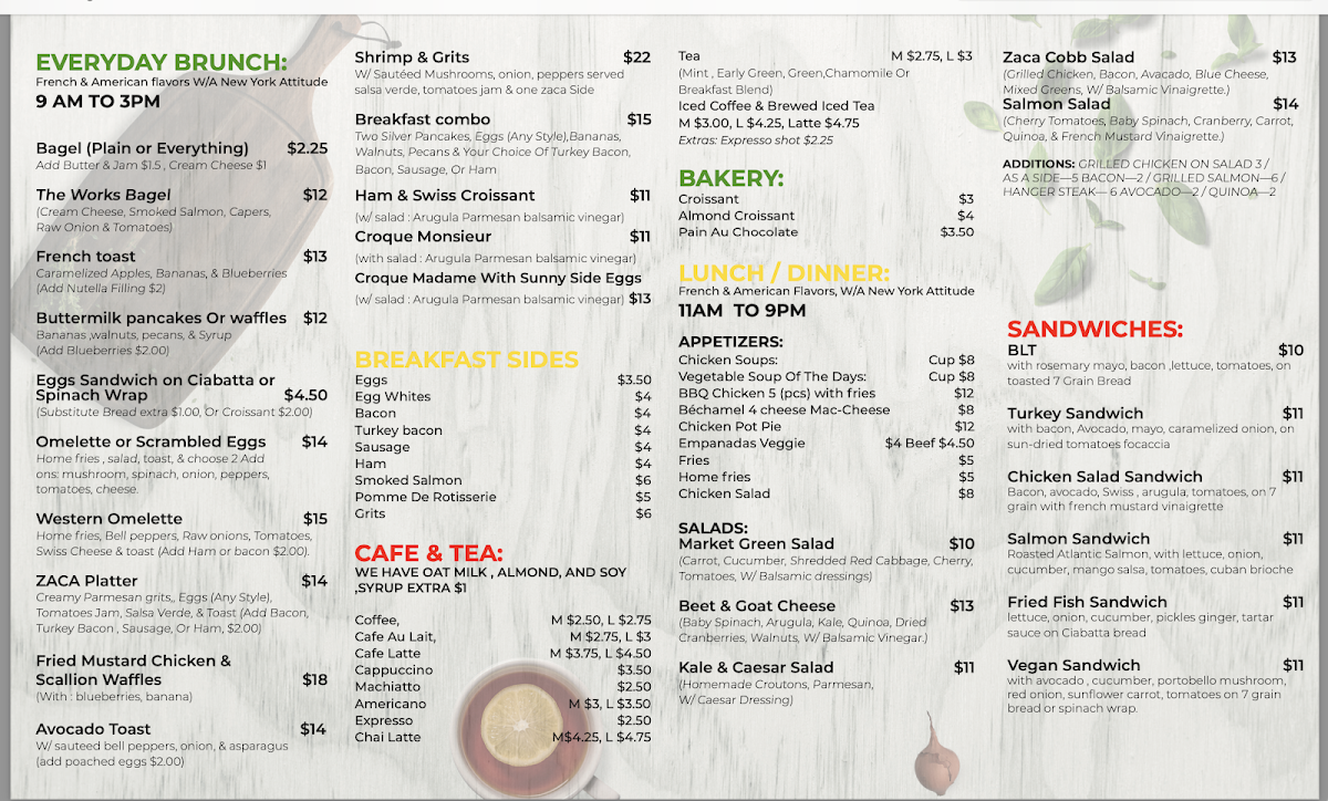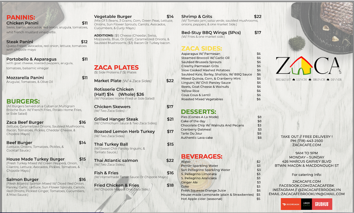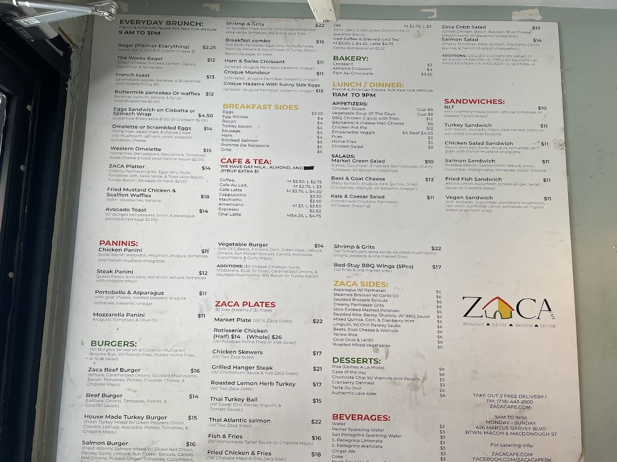 Welcome to ZACA CAFE, a delightful culinary gem nestled in the heart of Brooklyn, NY, at 426 Marcus Garvey Blvd. This cozy eatery has quickly gained a devoted following for its innovative menu and welcoming atmosphere, making it a top contender for both brunch lovers and lunch seekers alike.